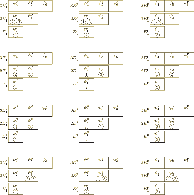 For distribution B of figure 6.8, under the symmetrization requirement the three energy eigenfunctions in the first row must be combined into one, the six in the second and third rows must be combined into one, and the three in the fourth row must be combined into one. That gives a total of 3 system eigenfunctions for distribution B, as shown in figure 6.10.